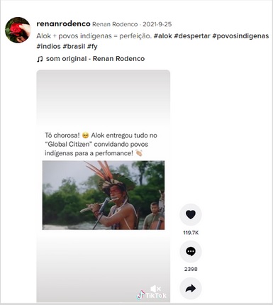 Within a cross-platform analysis perspective, we collected data from Twitter, Instagram and TikTok from the same profiles of indigenous influencers, based on the aforementioned hashtag. From this point on, we identified that, on each platform, a different type of communication resource was used: on TikTok, some more recurrent trends on the platform were used; on Twitter, posts of a political-institutional nature were published; while on Instagram, campaigns were carried out for causes connected to the environmental and indigenous agenda.